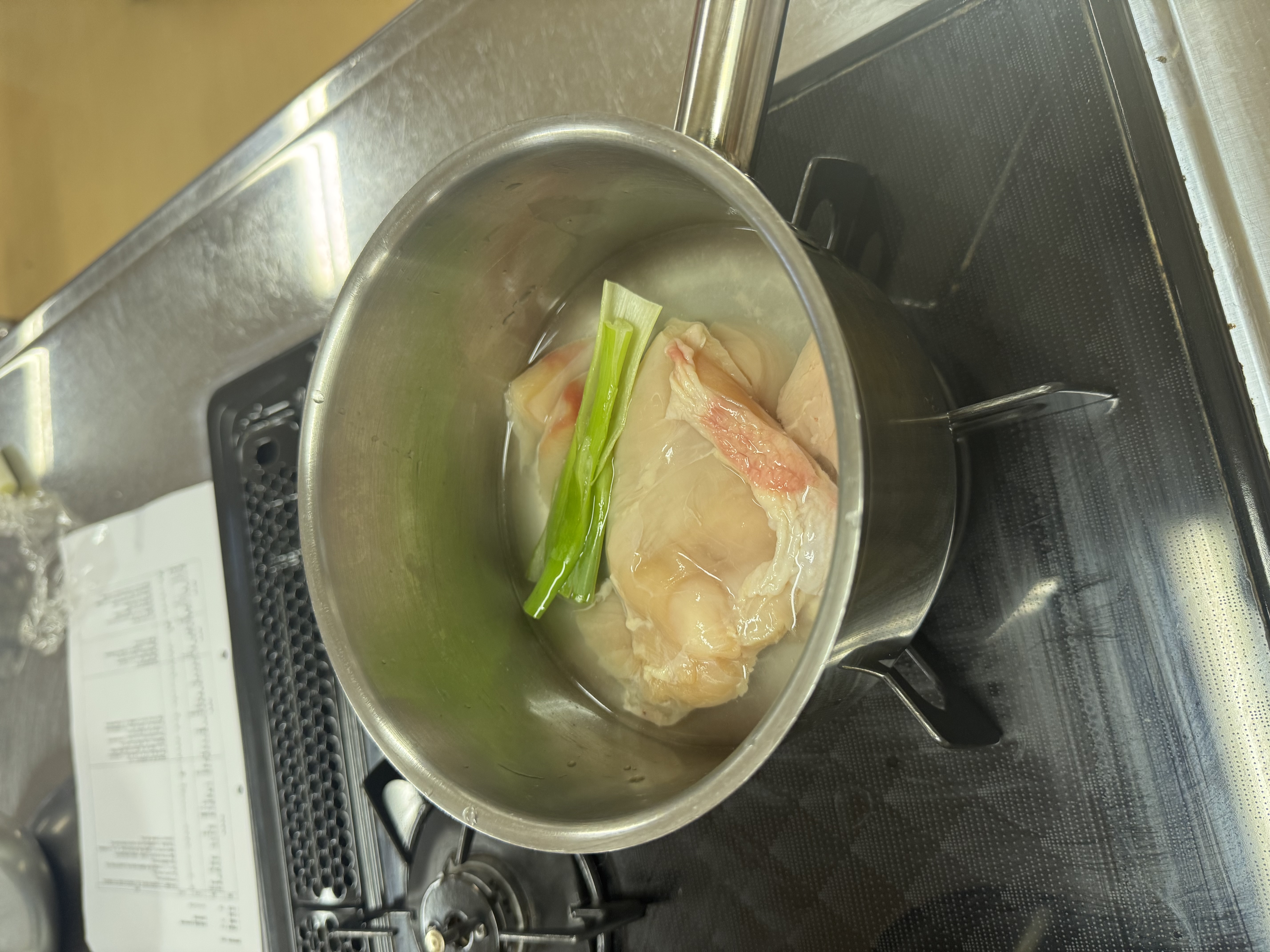水・酒・ネギの青い部分・生姜の皮を入れ、