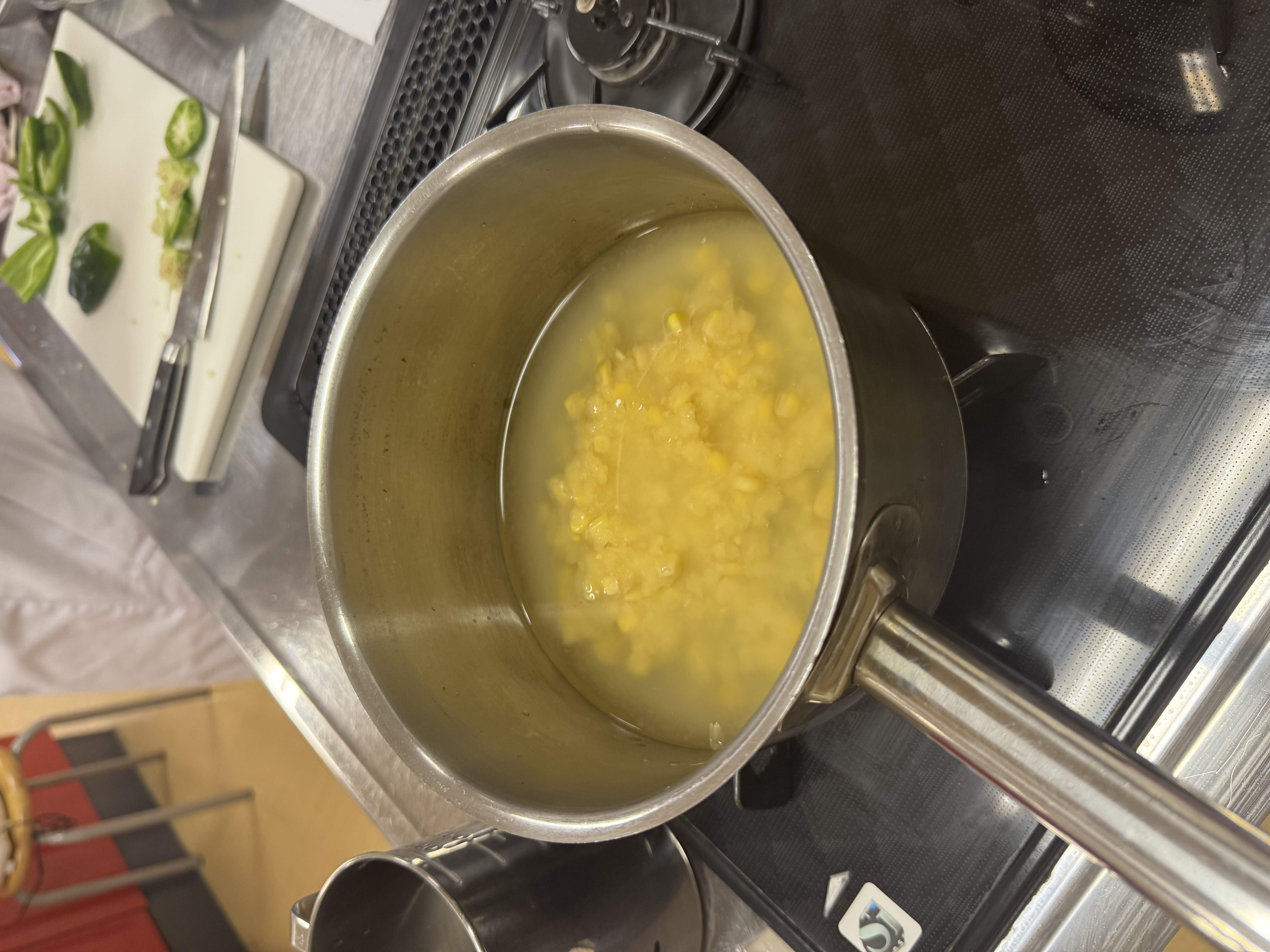 鍋に中華出しを温め、コーンを入れて煮たたせる。