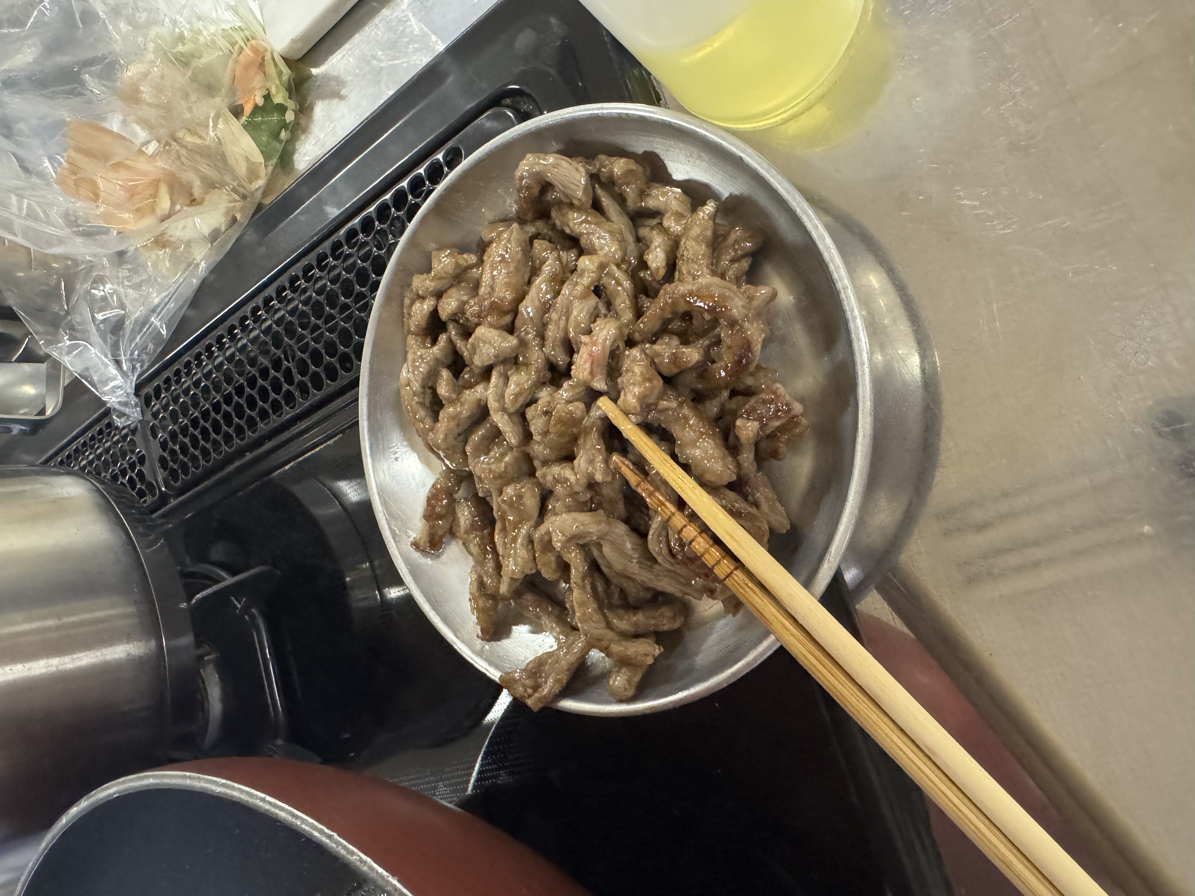 牛肉は繊維に沿って千切り、酒・濃口醤油を入れ、片栗粉・サラダ油を混ぜ合わせておきます。