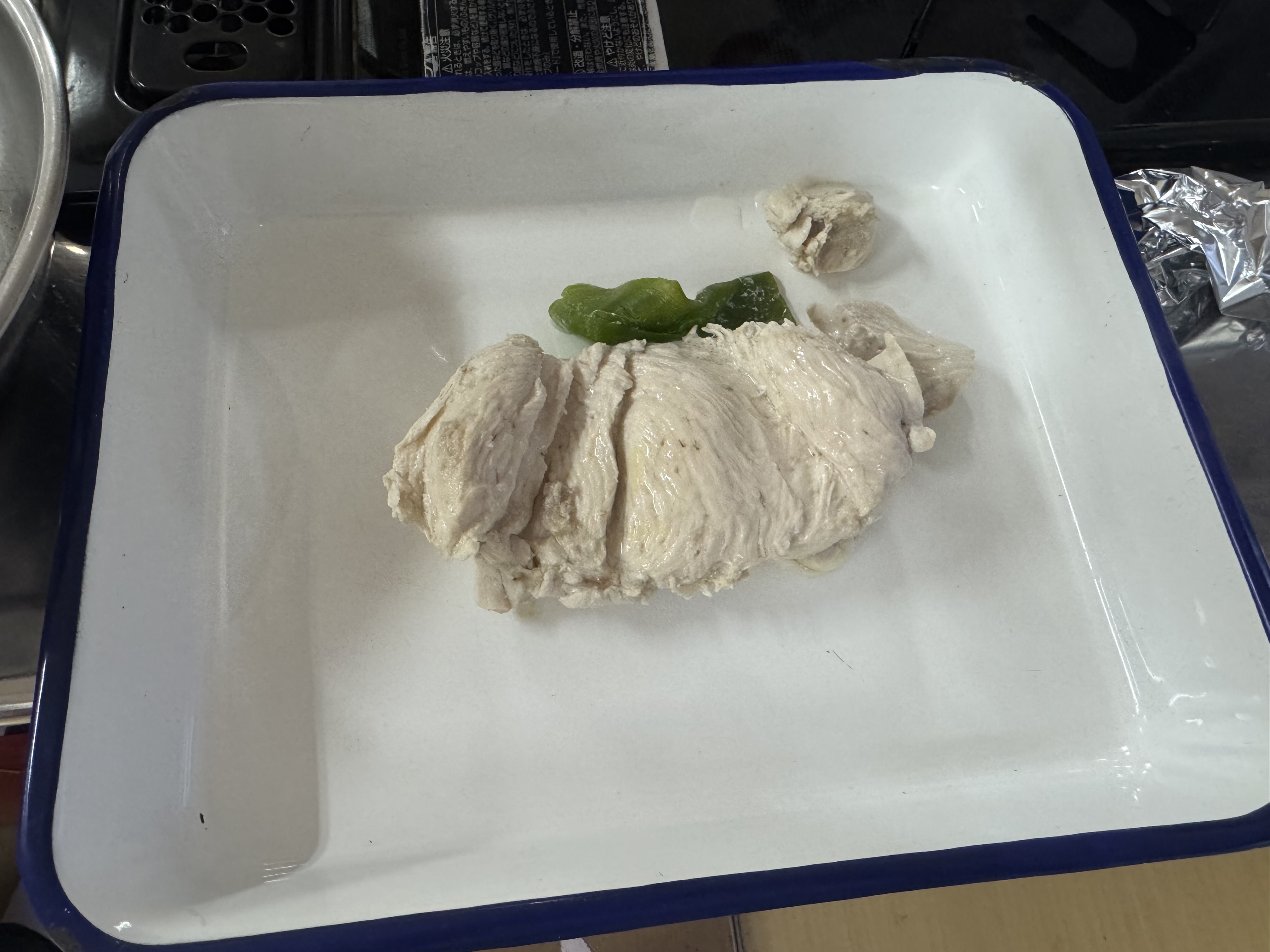 火が通れば取り出して、冷ましてから手で裂く。皮は千切り。