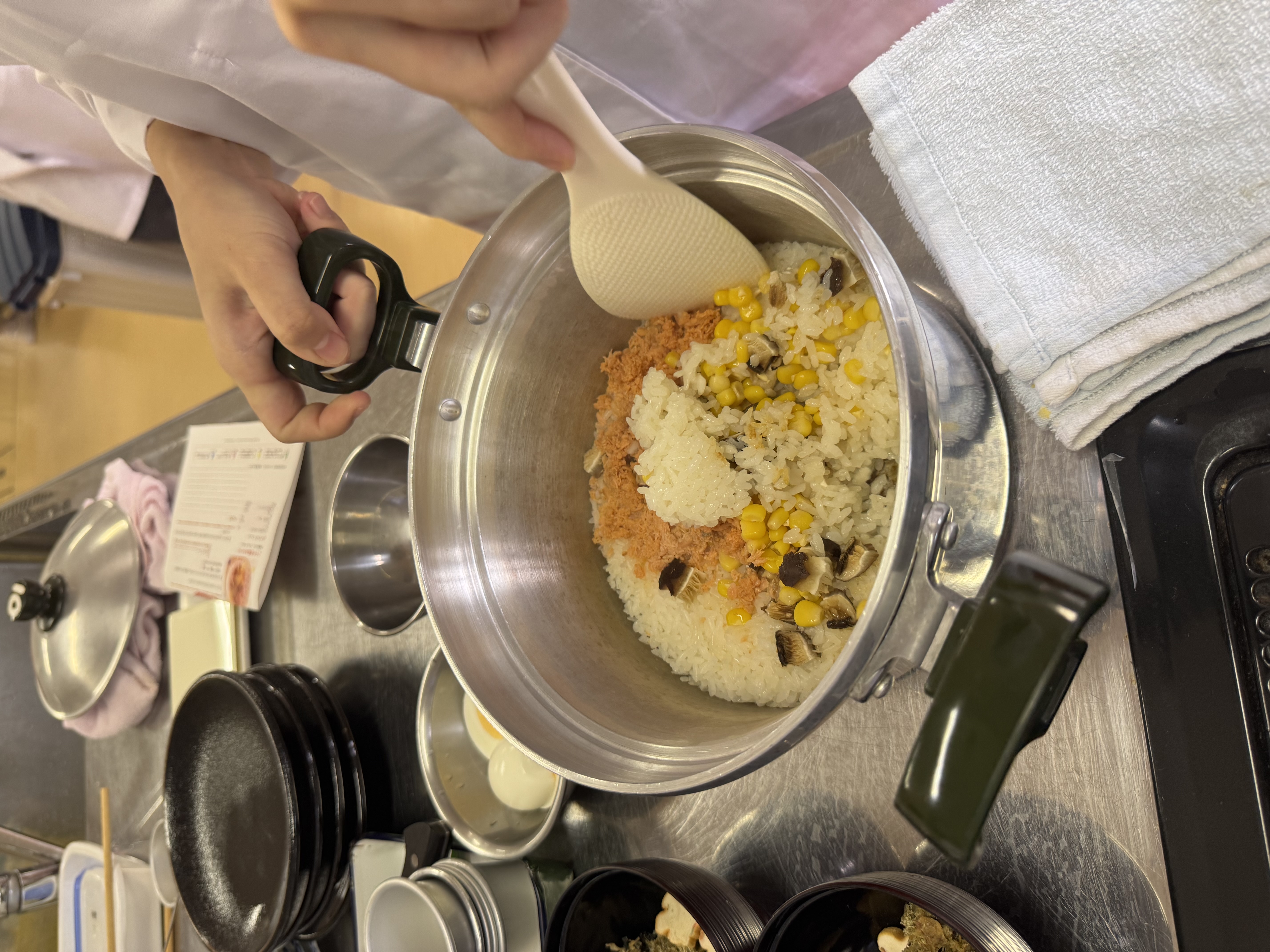 トウモロコシと鮭フレークも入れ、鍋で炊きます!