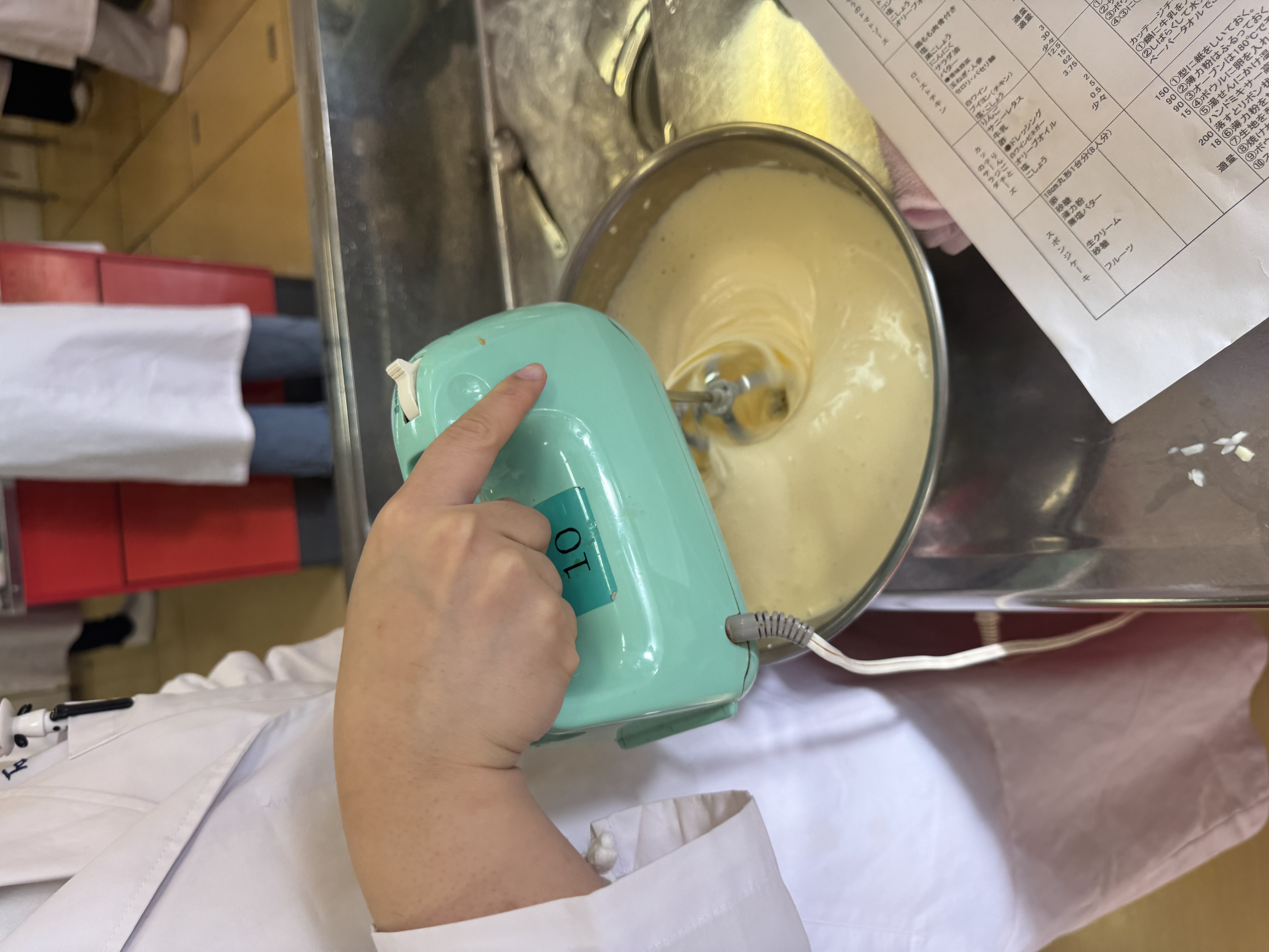 湯せんにかけ36℃ぐらいになれば、湯せんからおろして高速で泡立てる。